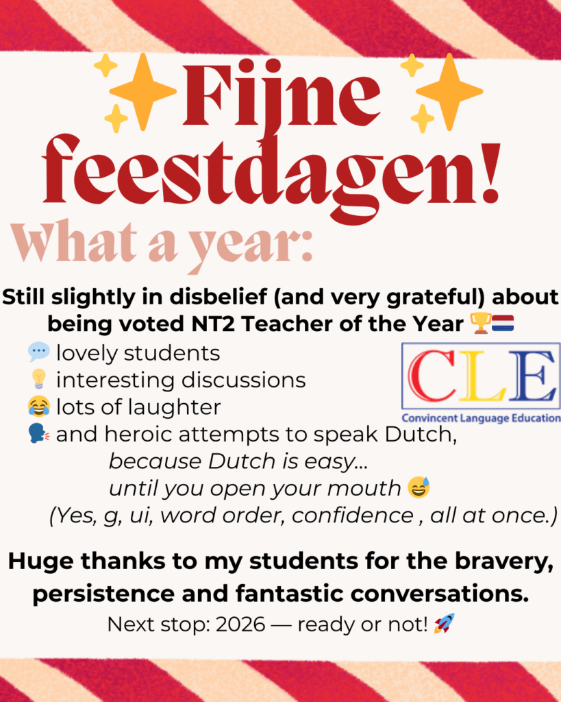 - Improvising, using humour and encouraging you to discover the Dutch language yourself.